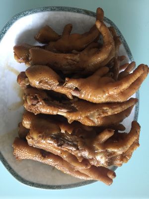 鸡爪沸水后洗净剪掉指甲。放入所有的配料再放盐、糖,料酒、红烧酱油。煮15至20分钟(看火候)。