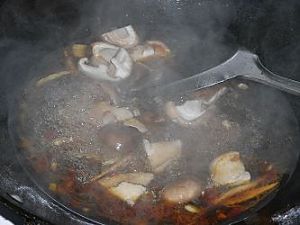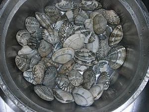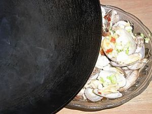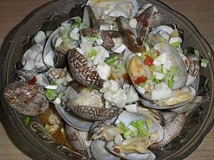 倒入花蛤加料酒,盐烧五分钟盛出。