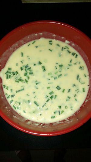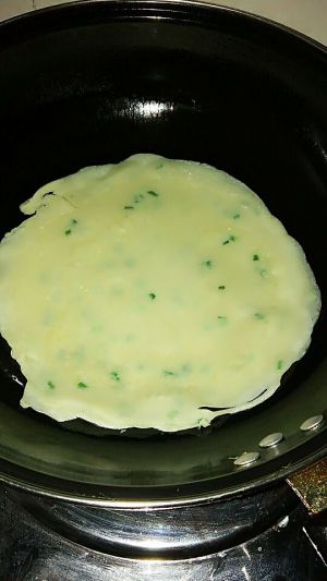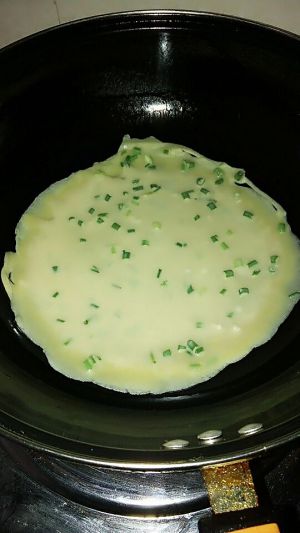 把调好的面糊,用勺子倒入锅内,把锅左右摇晃下,面糊会慢慢流动开来