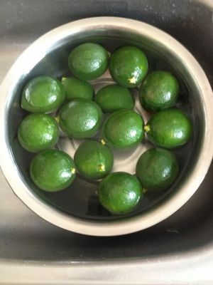 青柠檬用盐水泡一会儿,然后用盐搓表面去蜡,再泡10分钟。