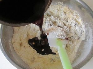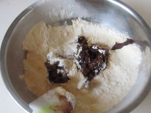 将三种面粉分别称重后放在容器内,加入苏打粉和泡打粉搅拌均匀, 再加入红枣泥;