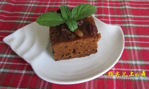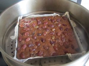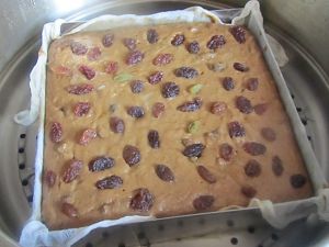 待发好的面团上撒上葡萄干,再开火蒸上四十分钟;