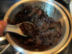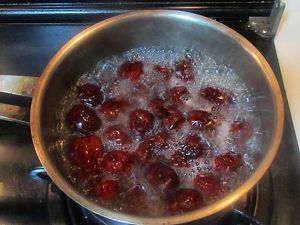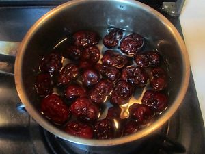 待稍凉后将红枣捞出,用勺按压红枣, 取出红枣核;