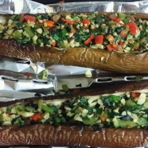 茄子洗净对剖但别全开,小刀划斜纹,送烤箱上下200度,烤20分钟。烤茄子同时准备配菜。