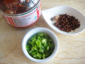 青椒洗净后切碎,准备郫县豆瓣酱和油辣椒