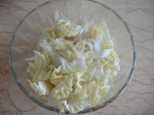 将肉片和汤汁一起倒入铺好白菜的大碗中上面加入青椒碎