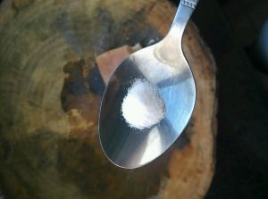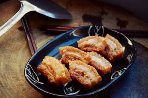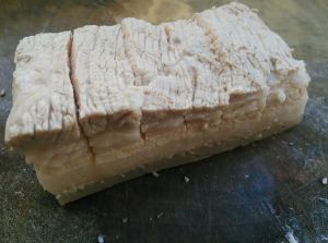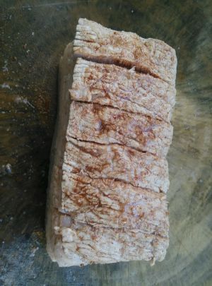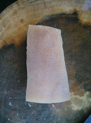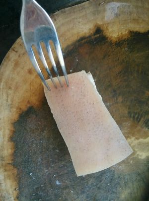 猪皮上抹上盐和小苏打,小苏打一定要少一点再少一点,图上的已经多了