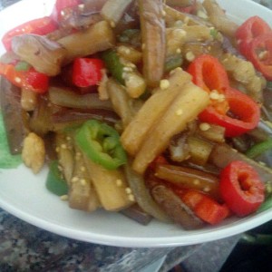 锅里放油 到入辣椒翻炒出香放入茄子翻炒