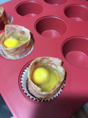 面包片用小碗切成圆片,面包圆片和培根平底锅煎一分钟