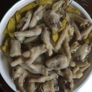 矿泉水中放入泡椒、盐一勺、鸡精适量、糖适量、白酒一勺、醋5勺。水莫过鸡爪放入冰箱冷藏3小时。