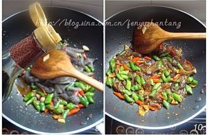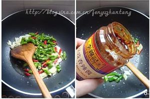 下青红椒翻炒。倒入2汤匙李锦记豆豉香辣酱、料酒继续翻炒。