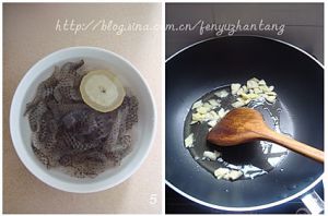 捞起后过冷河,然后放入柠檬冰水中浸泡5分钟。锅里下油,爆香蒜瓣和姜片。