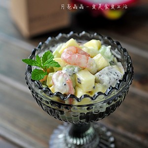 把所有水果去皮去核切小丁,放入一个大碗中,同时放入北极虾仁。