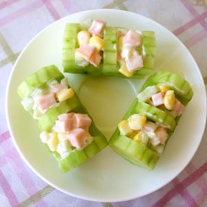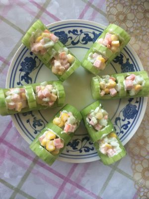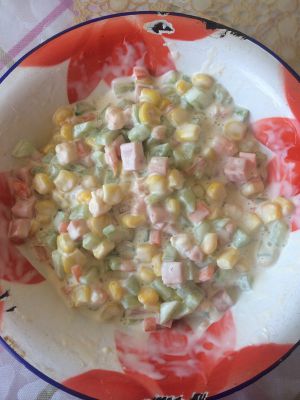 虾仁蒸熟,去壳,切段;玉米放沸水里焯一下。之前切除的黄瓜、胡萝卜、午餐肉切粒,装碗里用沙拉酱拌匀。