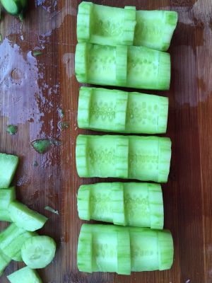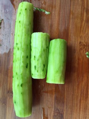黄瓜洗净、去皮,切段。