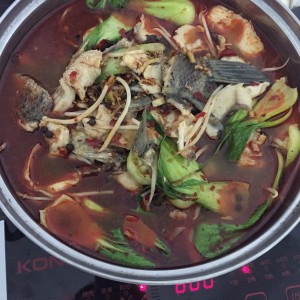 炒香底料后加入适量水大火煮沸,先放入鱼头,一分钟后加入鱼骨后加鱼肉,全部加入后放入油菜豆芽和干豆腐。稍开锅可放入电磁炉专用锅,冬天在家吃,边吃边咕嘟~热乎乎滴!