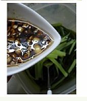 兑汁:蒜头拍碎,倒入适量的生抽、香油、凉拌汁、白糖、味精搅拌成调味汁。