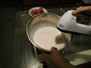 继续搅拌直到牛奶、酸奶和草莓完全融合。