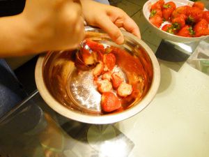 将草莓用淡盐水侵泡5分钟,洗干净,去蒂捣碎,越碎越好。