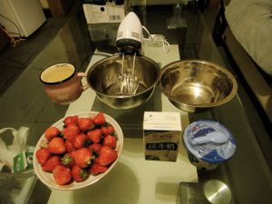 做草莓酸奶需要的材料有:草莓、牛奶、酸奶、打蛋器和两个盆子。