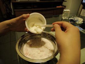 然后加入牛奶用打蛋器搅拌均匀,再加入酸奶,用打蛋器搅拌均匀。