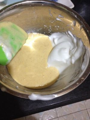 蛋黄糊倒入剩下的2/3蛋白中,翻搅均匀。