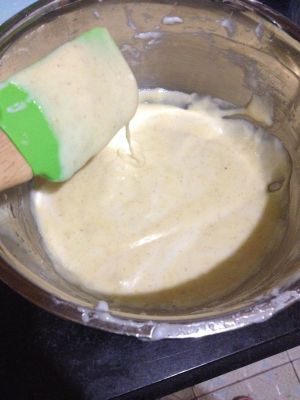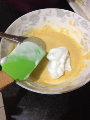 1/3的蛋白加入蛋黄糊,上下翻搅。