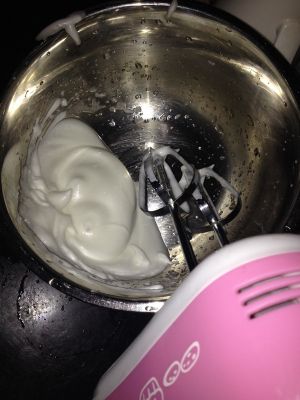 15g白糖,分两三次加入一个蛋清,打发到湿性发泡。