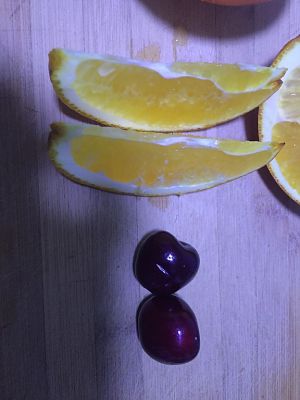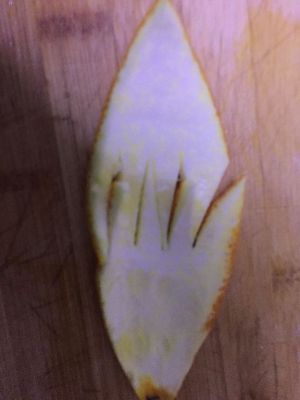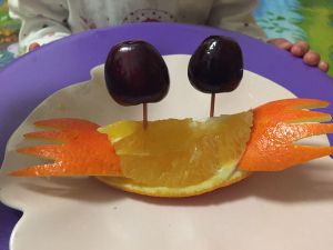 将其中一块橙子去去肉,用刀划成螃蟹的钳子