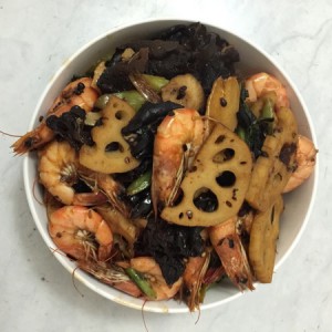 油八分熟的时候放入干辣椒和花椒煸炒!然后放入葱姜蒜继续煸炒!煸炒出香味即可!不要炒太久!辣椒容易苦!然后放入虾先进行煸炒,之后放入其他菜品!进行翻炒!炒至蔬菜熟后,放入鸡精少许、盐适量、酱油少许、醋少许!继续翻炒片刻!入味起锅!