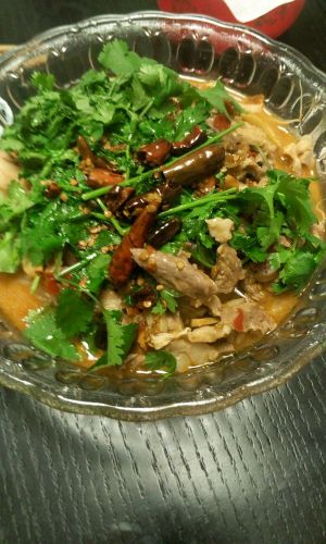 放入香菜,把辣椒油热时迅速浇入碗中,美味的求助肉片完成啦。