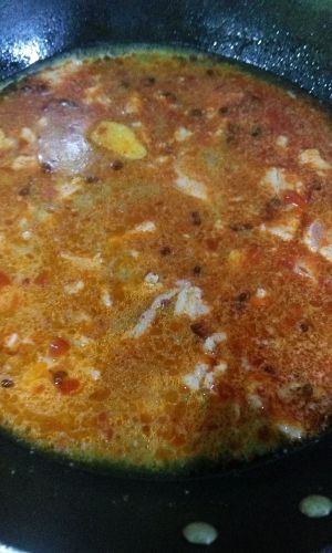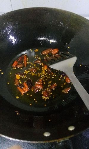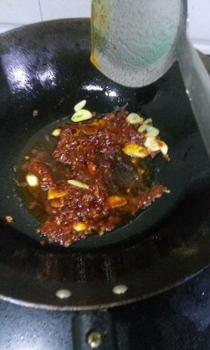 油热放入花椒炒出香味后加入姜片和蒜片炒香,然后加入郫县豆瓣酱炒一会放入热水。