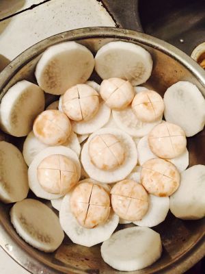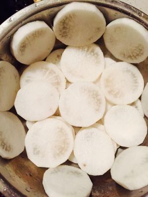 口蘑一朵切四份 排在白萝卜上
