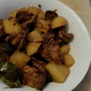 当排骨煮到烂时,放入泡发的香菇,稍后放入土豆。