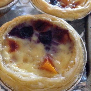 倒入挞水,放入蓝莓,正好烤箱也预热好了,先放入最下层烤10分钟,上下火