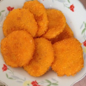 南瓜放锅里大火蒸3分钟,筷子能穿透南瓜即熟了,取出放碗里用勺子压碎,之后加入白砂糖(不喜欢太甜可以加少量或不加),糯米粉(糯米粉可以少量慢慢加入)和的软硬度可以跟我们的耳垂差不多软,接着去一小部分揉圆压扁沾上面包糠。