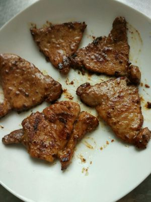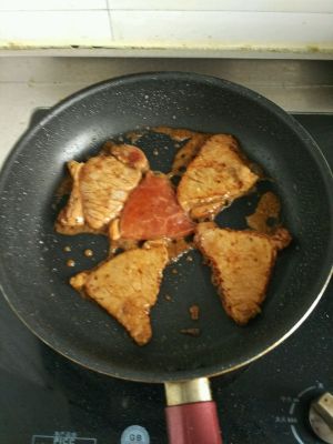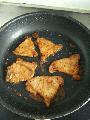 大火煎制两面,转小火煎熟即可。腌制的酱汁也不会浪费哦!在锅里变稠都会敷在肉片上。猪扒比牛排更容易被小孩咀嚼哦!用里脊肉的话,火候可以轻一点。