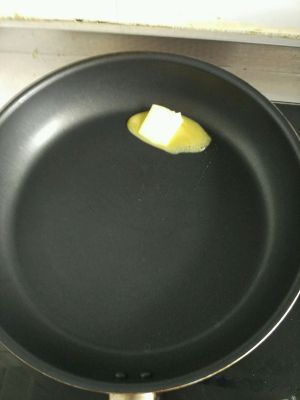 不粘锅,加黄油开始煎制吧!没有黄油,植物油也可以。