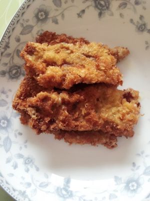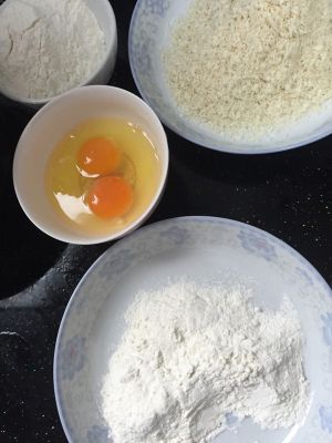 淹好的肉排先滚一层面粉,再裹一层鸡蛋,最后粘上面包糠,锅中加油烧热,中小火炸熟即可