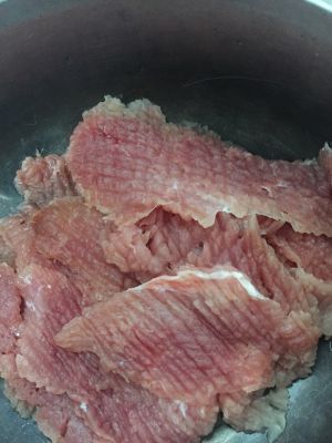 将猪肉切厚片用刀背拍松
