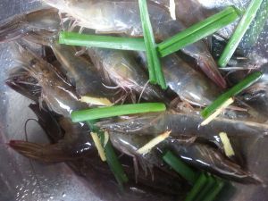 将虾用葱、姜、料酒拌匀腌制10到20分钟