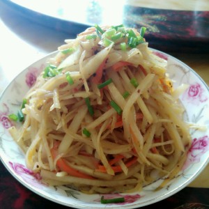 烧开一锅水,焯土豆丝,胡萝卜丝,土豆丝不能焯太久,2分钟即可,久了土豆丝不脆了,焯好水的土豆丝捞出放进准备好的凉水里过水,沥水备用!