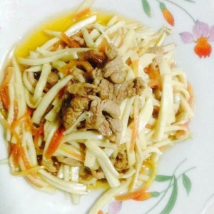 肉丝炒至乳白色,放入胡萝卜丝,杏鲍菇丝翻炒