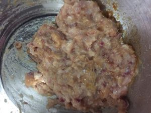 我买来是两斤多的鱼,大概一起用了60克淀粉,大概抓的时候感觉粘粘的,就差不多了!包心的味道可以重一点,外衣的清淡些,你也可以根据口味在包心加别的,不过我喜欢保留鱼本来的味道多一点!