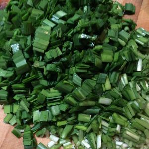 韭菜盛入碗中,加入盐,鸡精,椒盐粉和1勺玉米油搅拌均匀。