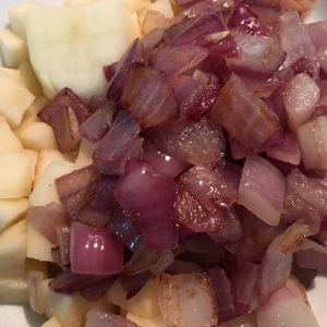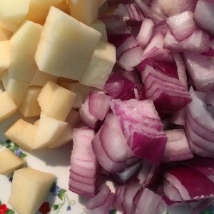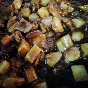 鸡腿肉变色后,把洋葱和土豆放入锅中,煸炒熟后,放咖喱块,微辣日式咖喱