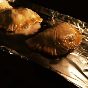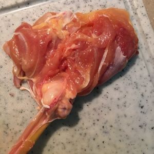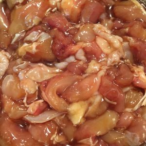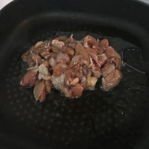 鸡腿肉脱骨后,切小块,用料酒加少量白酒和适量蚝油腌制