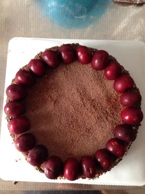 16、把巧克力屑粘在蛋糕的侧面及顶部。每朵奶油花上放一颗罐头黑樱桃,再在蛋糕表面撒上一些糖粉,蛋糕就装饰好了。
