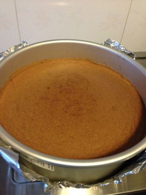 9、把蛋糕模放入烤盘里,在烤盘里倒入热水,高度以没过蛋糕糊高度的1/2为宜。如果是活底模,需要在模具底部包上一层锡纸,以防底部进水。把烤盘放入预热好160度的烤箱,烤1个小时左右,直到表面颜色变深,蛋糕完全凝固即可出炉。