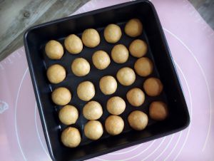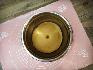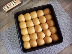 一发结束后,将面团进行排气,均匀分割成25份,滚圆后铺入模内。